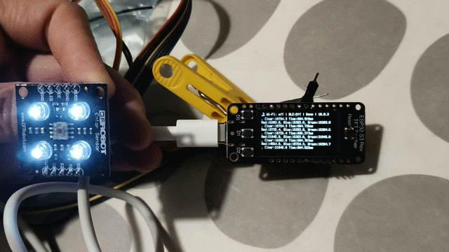 print(f"Red:{red}, Blue:{blue}, Green:{green}, Clear:{clear} Time:{dt}ms")最终效果: