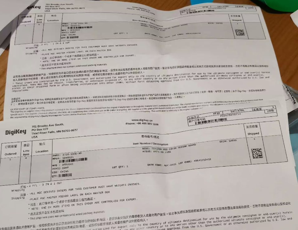 我是 11月 8 日下单,17日完成通关后顺丰寄过来,19 日签收。收到货物后对比去年的快递,比较明显感觉到了 得捷(DigiKey) 更环保了,估计是收到了客户反馈(之前物料包装太精细,不环保),这次快递总共四个零件, 每个零件都采用小包装+原包装,相对 而言少了之前不必有的大量防静电大袋子(个人感觉挺好)。