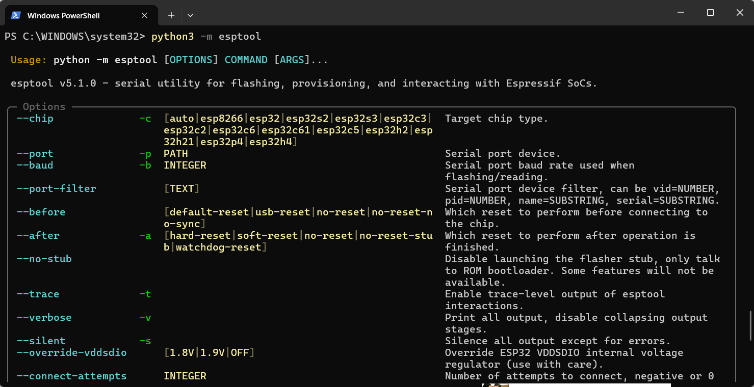 3.3 确认 esptool 环境安装成功: 执行 python3 -m esptool 输出如下: