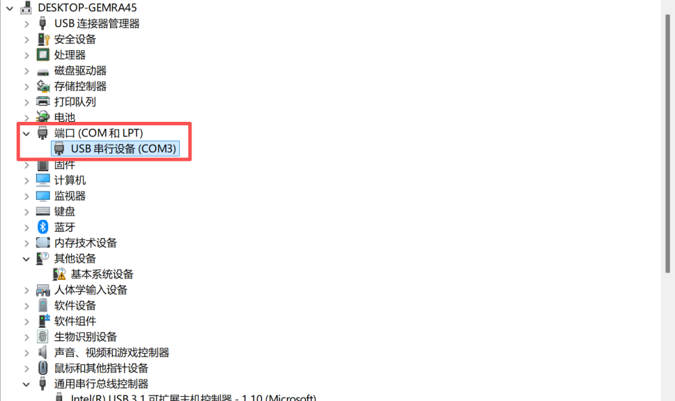 3.4 通过 设备管理器找到 当前设备的 COM 口(网页也可以看到)我是COM3