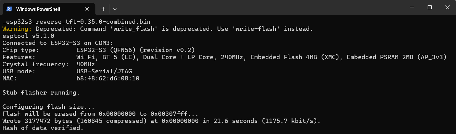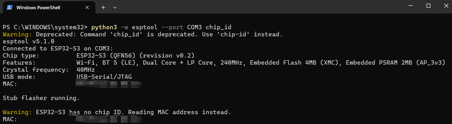 3.5 确认设备连接状态:python3 -m esptool --port COM3 chip_id
