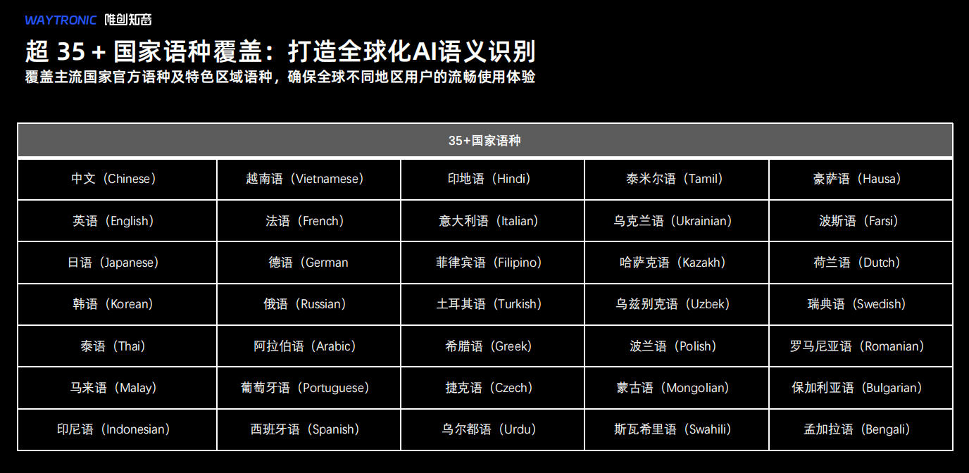 在万物互联的时代,语音是最自然的交互方式。而唯创知音要做的,就是确保这种交互没有语言的障碍、没有方言的隔阂、没有技术的门槛。35+语种、200+方言、30000+客户的数字背后,是一家技术企业对“让AI听懂全球每一种声音 ”愿景的执着追求,帮助国产设备在海外走的更顺畅。