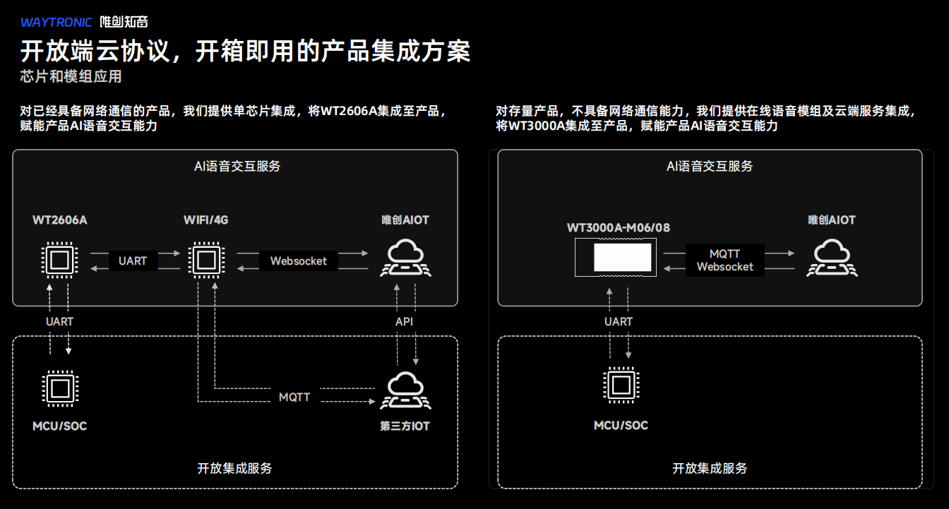 WT2606A交互芯片:适用于已具备网络通信能力的产品,通过UART接口快速集成,赋予AI语音交互能力。