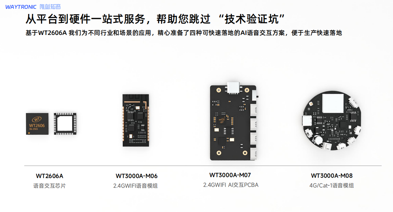 唯创知音深知,中小型硬件厂商最缺的不是idea,而是快速落地能力。为此,唯创提供了从芯片、模组到平台的全栈式解决方案,帮助客户“ 跳过技术验证坑 ”: